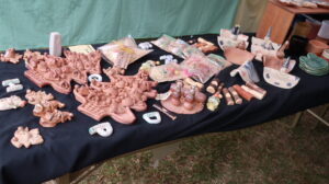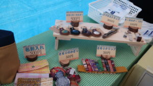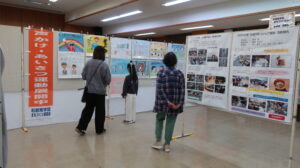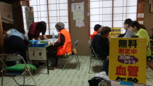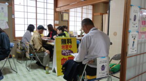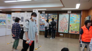 ふれあい広場では、木工、陶器、織物、コーヒー、野菜、ゲーム、制服の配布、健康チェックが行われ、缶バッジと筋力測定、血管年齢測定は、まちづくりセンター内に移動し、2階では、まち協や各区、学校施設の作品や声かけあいさつ運動の標語ポスターの展示がありました。