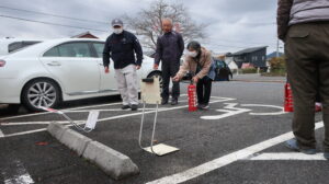 水消火器の使い方の説明を受けてから、的に向かって消火訓練をしました。