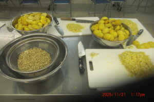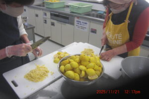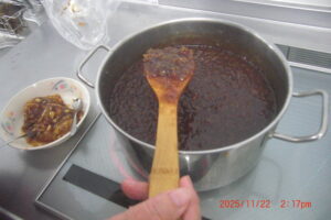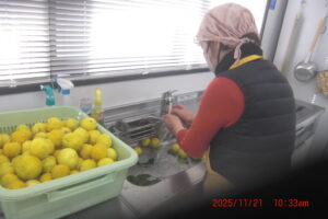 11月25日(火)柚子を洗い刻んだ柚子・米麹・調味料を鍋に入れ少し置いて発酵させます。